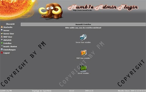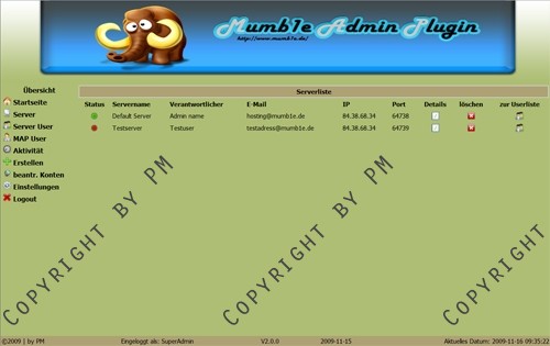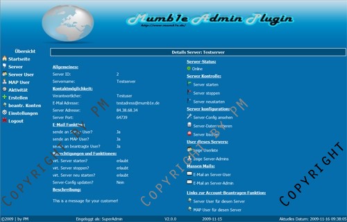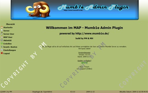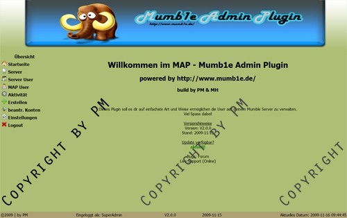Mithilfe des MAP (Mumb1e Admin Plugin) kann man User, Server, uvm. für den Mumble -/- Murmur Server ohne Probleme verwalten. Vorraussetzung ist, dass du mindestens einen vServer mit MySQL, PHP5 und der Murmur Static Version besitzt! Enthalten sind sämtliche Funtionen um einen Murmur Server (Mumble) komfortabel zu verwalten!